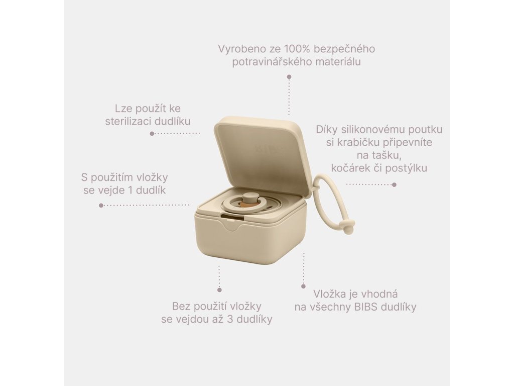 Krabička, box, pouzdro, obal, ... jednoduše pomocník, který ochrání dudlík před znečištěním, když ho zrovna nepotřebujete. No nejen to... BIBS krabička na dudlíky je zároveň i sterilizačním boxem na sterilizaci dudlíků v mikrovlnce nebo šikovnou krabičkou na jakékoli drobnosti, které chcete mít po ruce kdekoli jste. Jelikož je vyrobena z bezpečného potravinářského materiálu, je vhodná i jako dóza na drobný snack. Díky chytrému silikonovému poutku si BIBS krabičku na dudlíky připevníte na tašku, kočárek, ke postýlce, či autosedačce.