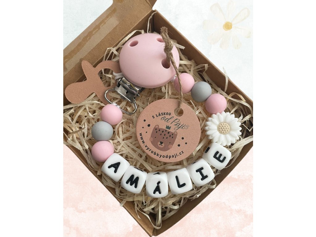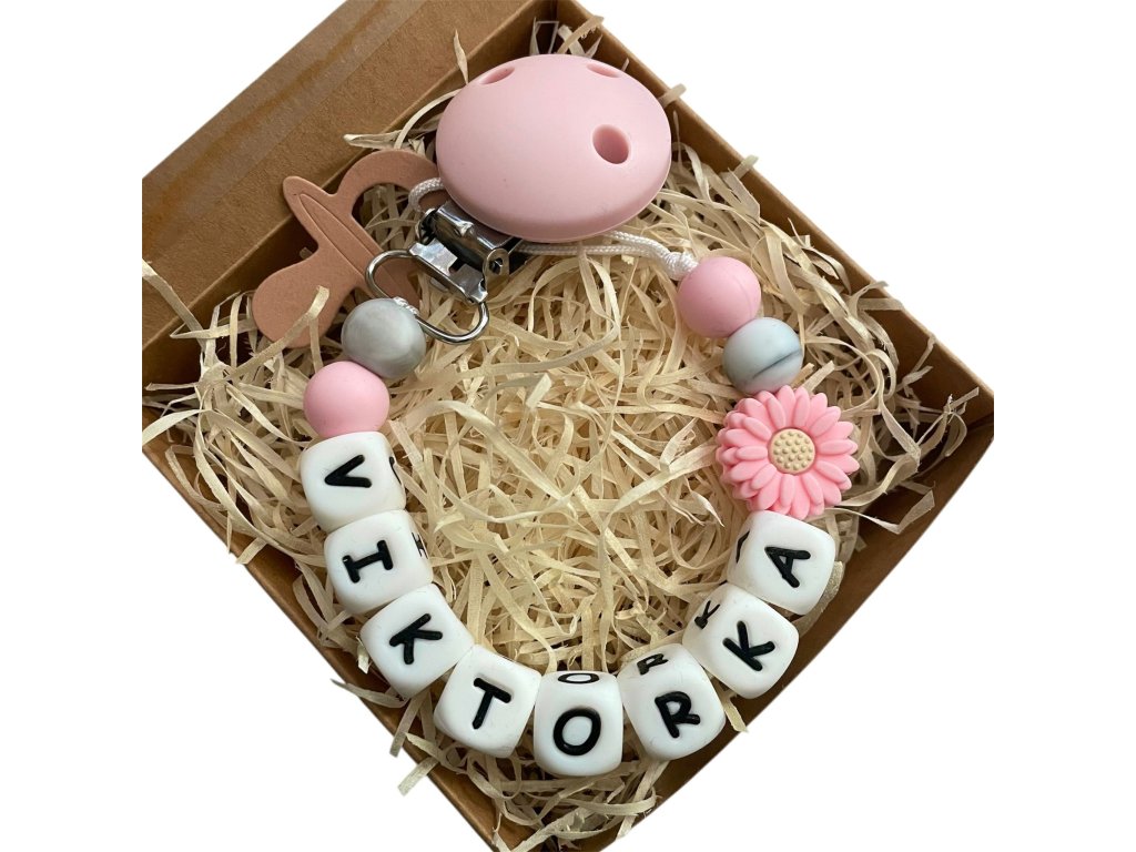 Klip na dudlík se jménem a kytičkou (různé barvy)