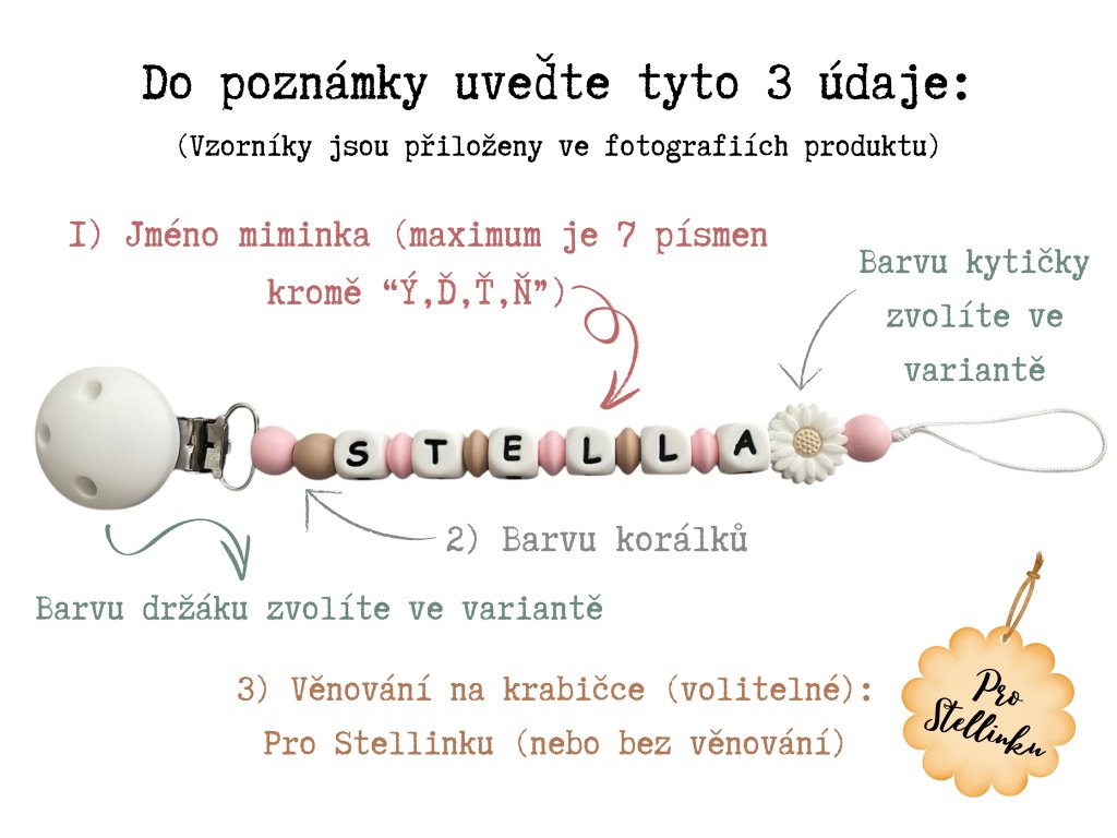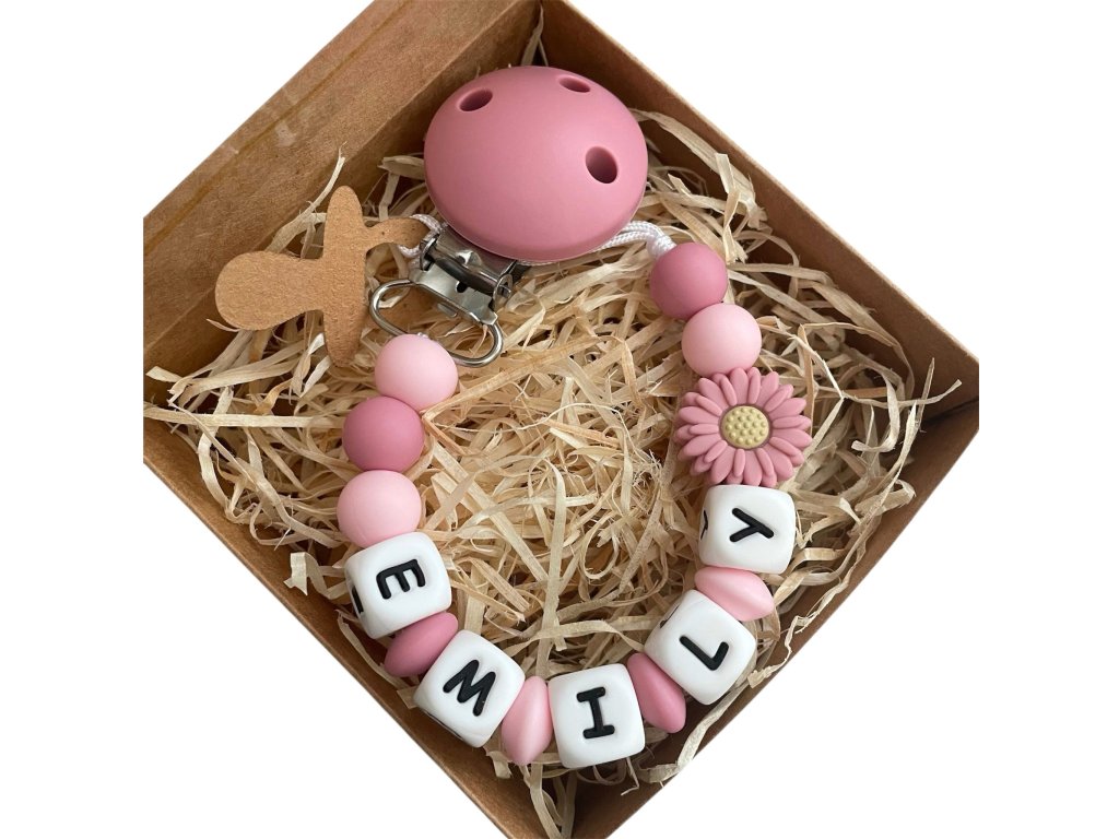 Klip na dudlík se jménem a kytičkou (různé barvy)