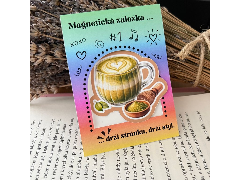 Záložka se přehne přes stránku a díky magnetům spolehlivě drží, takže se ke svému místu v knize vždy vrátíš bez hledání. Ideální pro milovníky matchy, kavárenské atmosféry a jemného, hravého designu.
