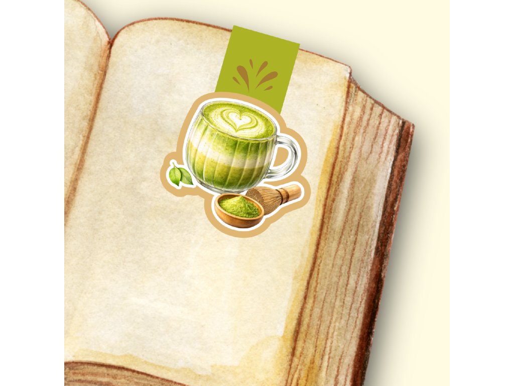 Magnetická záložka s motivem matcha latte je inspirovaná pomalými rány, teplým nápojem v dlaních a radostí z čtení bez spěchu.