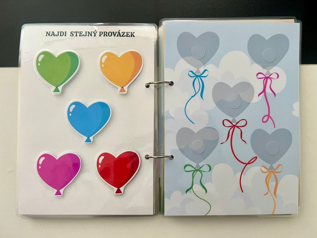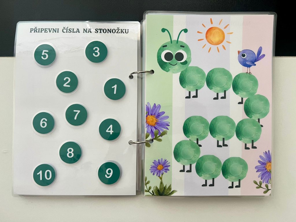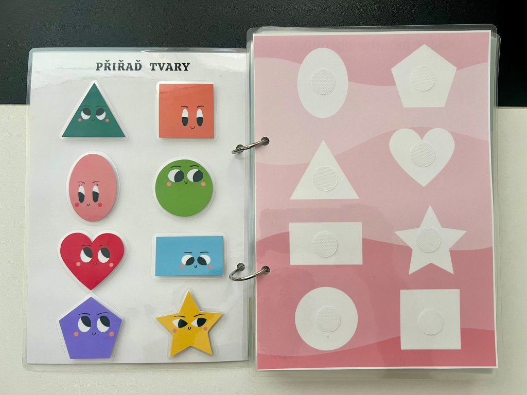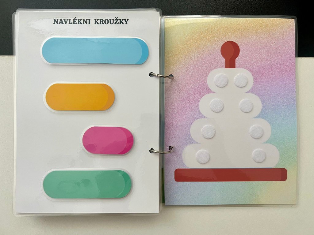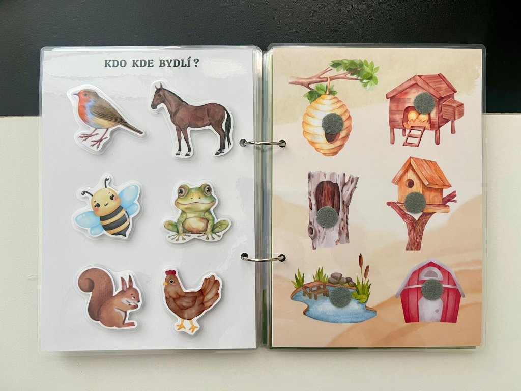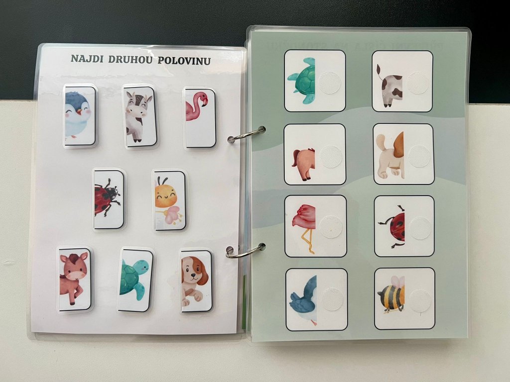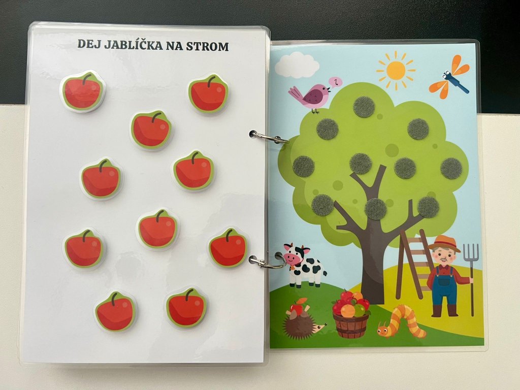 Tato ručně vyráběná interaktivní knížka je navržena tak, aby malé děti zapojily ruce, oči i hlavu. Každá stránka obsahuje aktivitu, kterou dítě řeší pomocí odnímatelných dílků na suchý zip – přiřazování, skládání, hledání či třídění.